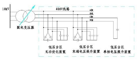 低压台区电能质量综合治理装置主要由低压台区无功优化装置和低压台区末端电压提升装置(包括三相和单相两种类型)组成。其应用于低压台区中主要实现配变有载分接开关自动调压、负荷三相不平衡调整、无功功率自动补偿和末端电压自动提升功能。